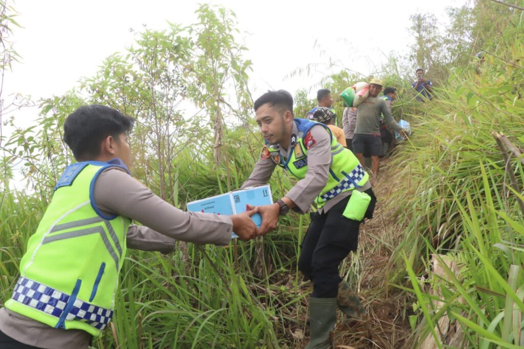 Bantuan berupa logistik bahan pangan  berupa beras sebanyak 60 karung serberat 300 kilogram beras dan kebutuhan pokok lainnya seperti mie instan, minyak goreng dipikul langsung oleh personel menuju permukiman warga terdampak.