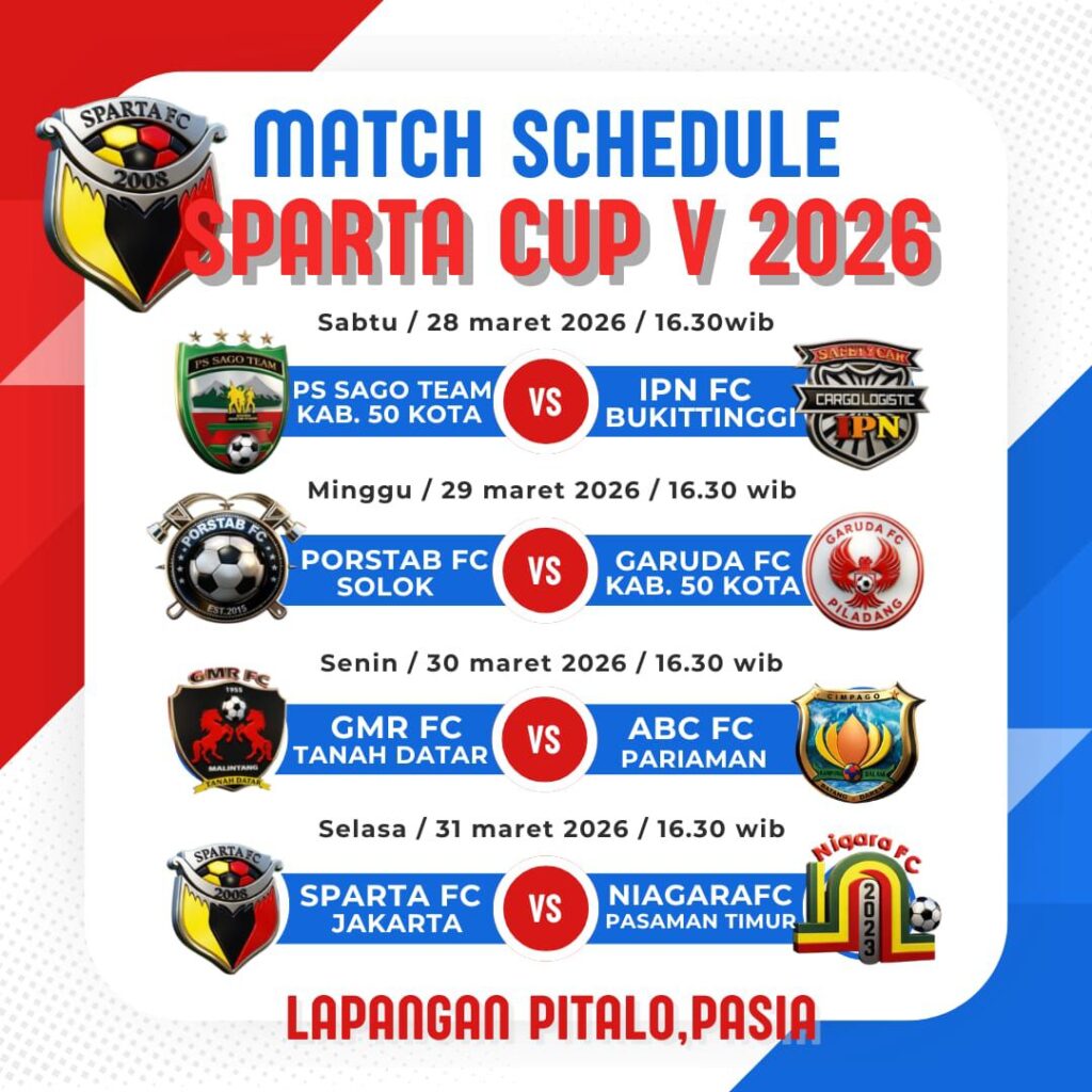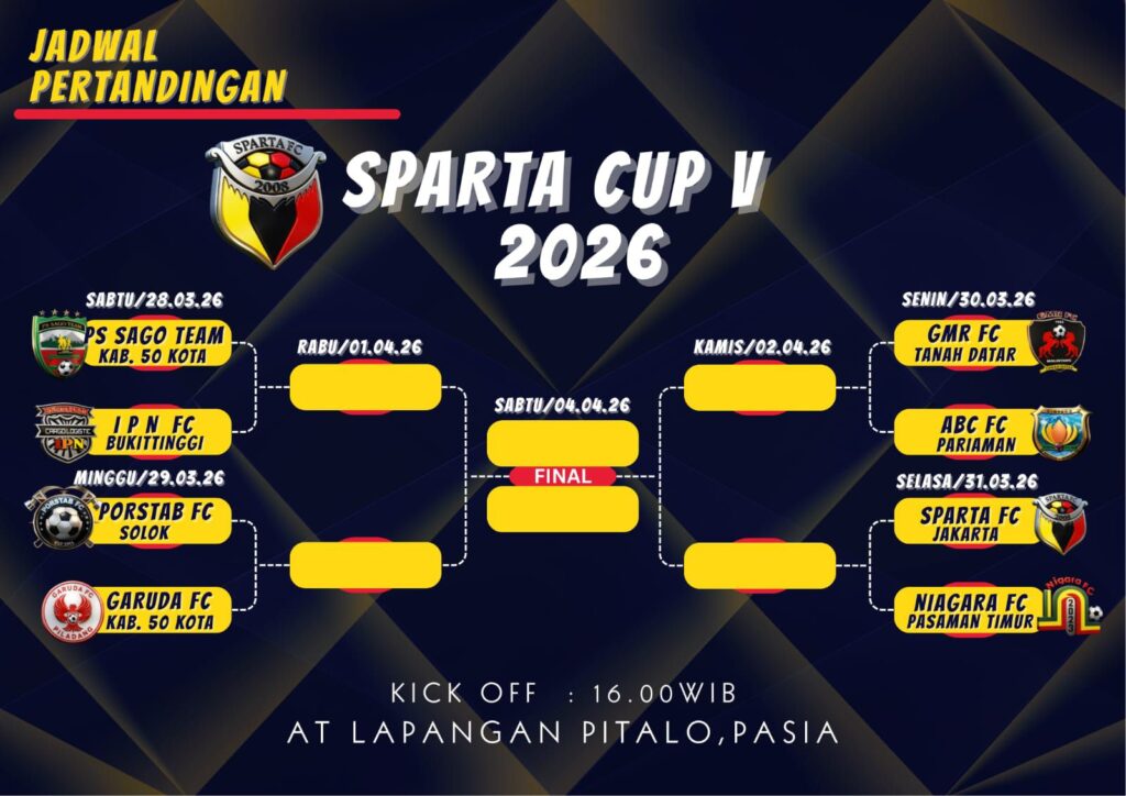 BUKITTINGGI.TOP – Turnamen sepak bola bergengsi Sparta Cup V 2026 kembali siap menggetarkan lapangan hijau dengan pertandingan penuh gengsi dan sportivitas. Ajang tahunan ini menghadirkan 8 klub terbaik dari Sumatera Barat, termasuk kembalinya “anak rantau” Sparta FC Jakarta.