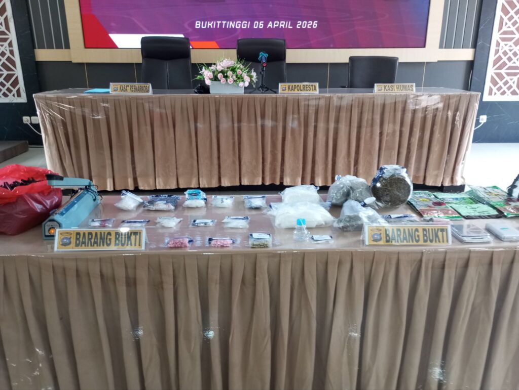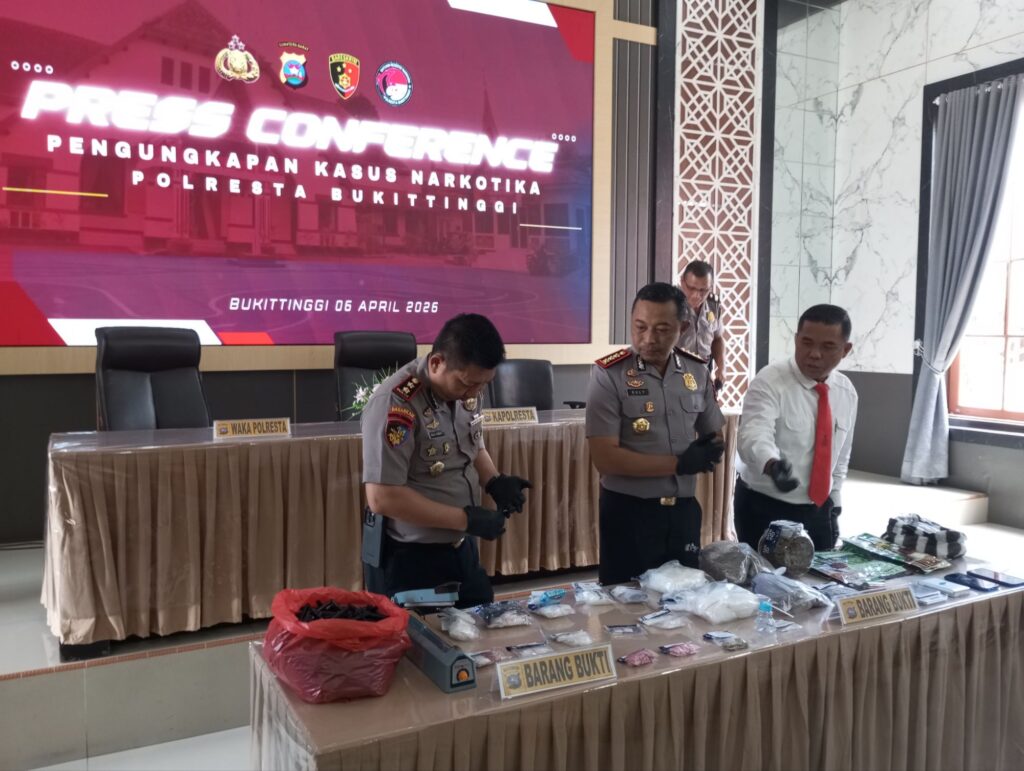 BUKITTINGGI.TOP – Polresta Bukittinggi menggelar konferensi pers, pada Senin 6 April 2026,terkait pengungkapan kasus narkoba yang dilakukan tim gabungan dari Sat Resnarkoba Polresta Bukittinggi bersama anggota Intel TNI AD kodim 0304 dan Korem 032 Wirabraja.