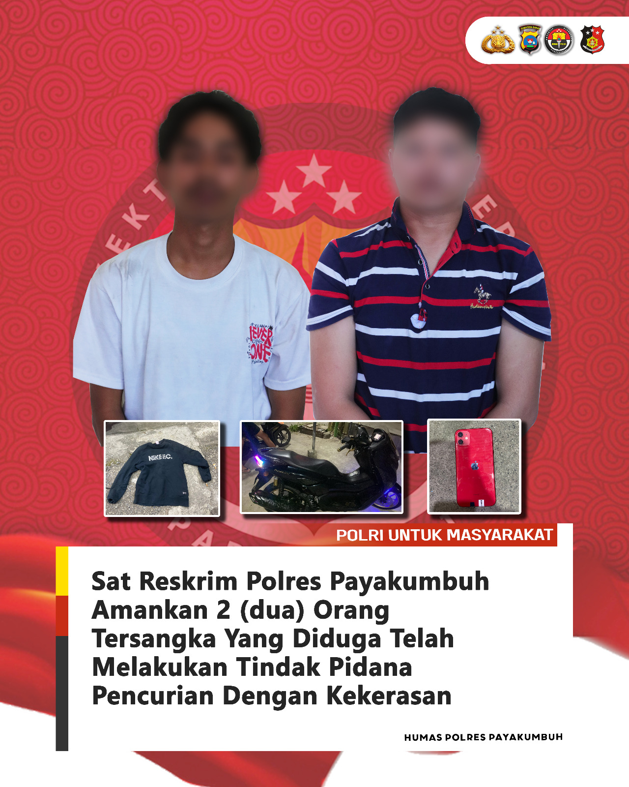 Kapolres Payakumbuh AKBP Ricky Ricardo, S.I.K.S.H.M.H melalui Kasat Reskrim IPTU Andrio Siregar, S.H.M.H bersama Kapolsekta Payakumbuh Kompol Amirwan. S.H mengatakan, tindakan melawan hukum yang di lakukan dua orang tersangka ini selain merugikan korban dari segi materi juga mengakibatkan korban menderita luka berat patah di jari tangan serta luka-luka lainya pada bagian wajah dan perut.